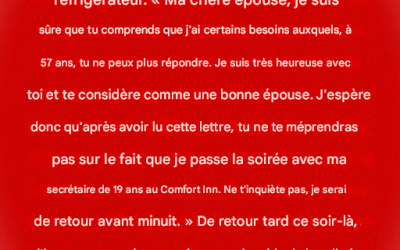 Imaginez que vous vous réveilliez un matin et que vous trouviez une note de votre bien-aimé négligemment collée au réfrigérateur,…
