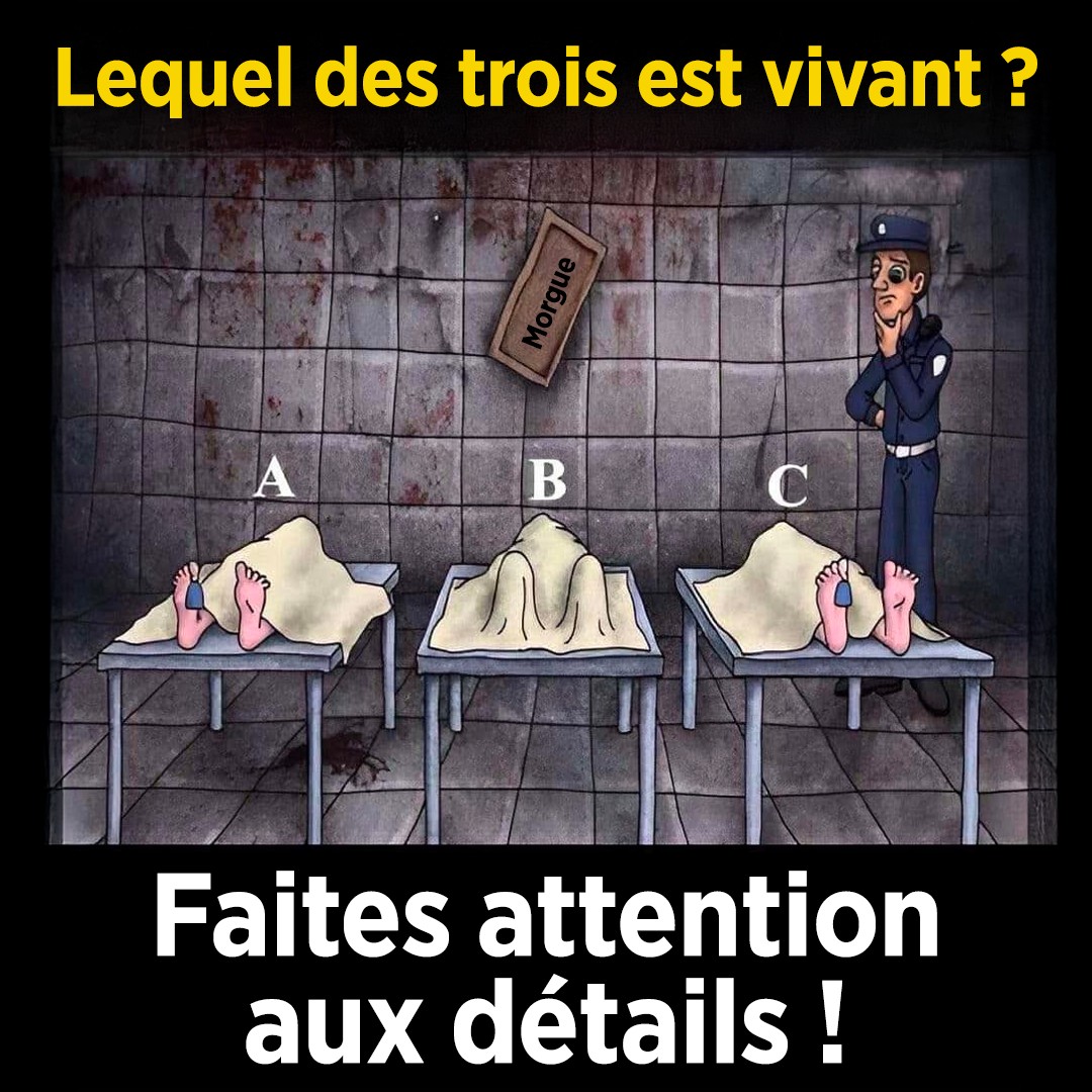 Un simple regard… et pourtant, tout peut vous échapper. Vous pensez avoir l’œil affûté ? Ce casse-tête visuel met votre sens du détail à rude épreuve. Trois personnes, une scène figée, une question troublante : qui est encore en vie ? La réponse est là, sous vos yeux, mais encore faut-il savoir observer avec attention. Prête à relever le défi et à faire travailler vos neurones comme jamais ?