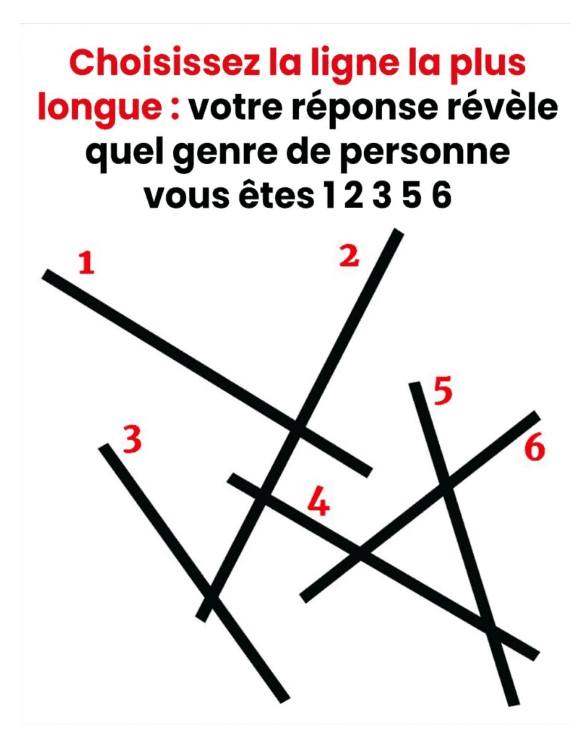 À première vue, c’est un petit jeu sans conséquence : six lignes noires, numérotées de 1 à 6, dessinées côte à côte. Votre mission ? Indiquer laquelle vous semble la plus longue. Facile, non ? Et pourtant… derrière ce choix apparemment anodin se cache un test fascinant sur votre perception et votre façon d’aborder la vie. Alors, prête à découvrir ce que votre intuition révèle sur vous ?