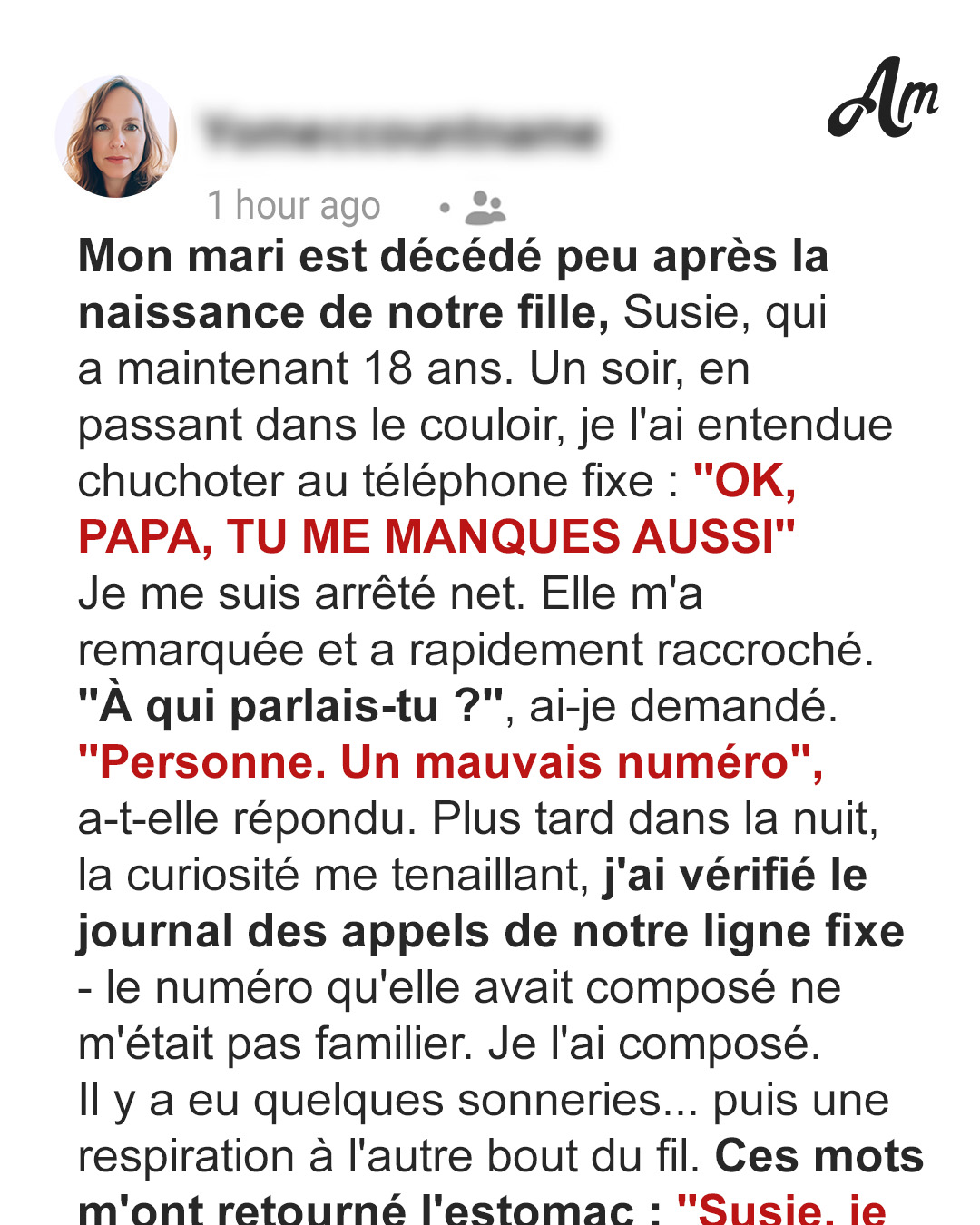 Quand Allie entend sa fille dire « Tu me manques, papa » sur la ligne fixe, son monde se fissure. Son mari est mort depuis 18 ans, du moins c’est ce qu’elle croyait. Alors que des vérités troublantes se dévoilent, Allie est forcée d’affronter le passé et le mensonge qui ont façonné toute leur vie.